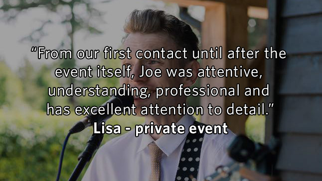 Whether you’re still researching entertainers or you know you’d like to book a musician at your event, Joe would love to hear from you. Put in your details below to receive a detailed quote from Joe within 24 hours of sending your message. If you’d prefer to email or call Joe, you can find him at joegarveymusician@gmail.com or on +447943656557.